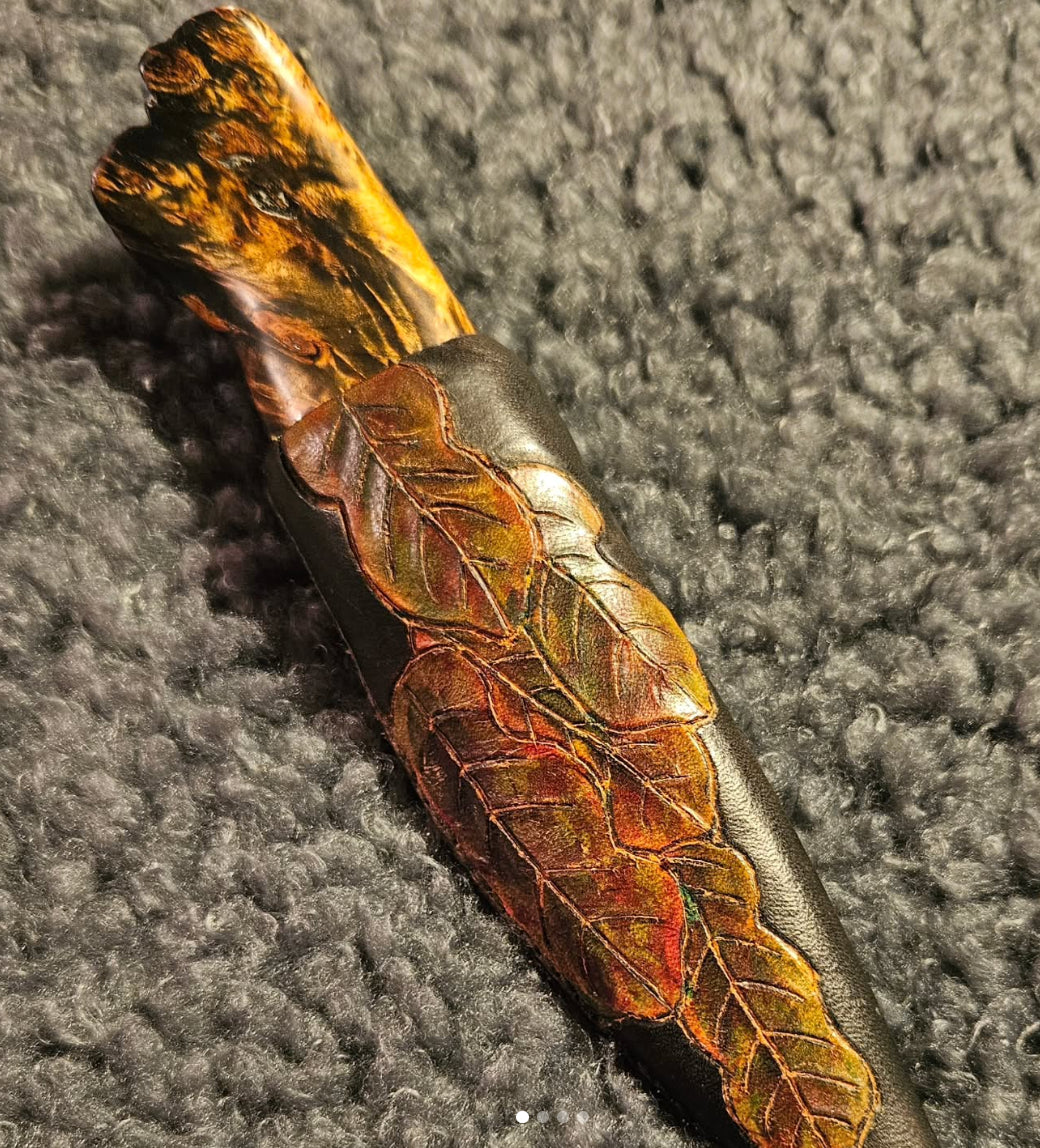 Där låg den, tills jag en dag var på besök med ett nyss smitt knivblad i handen, på jakt efter ett skaftämne. Han plockade fram bit efter bit, men inget föll mig i smaken.
